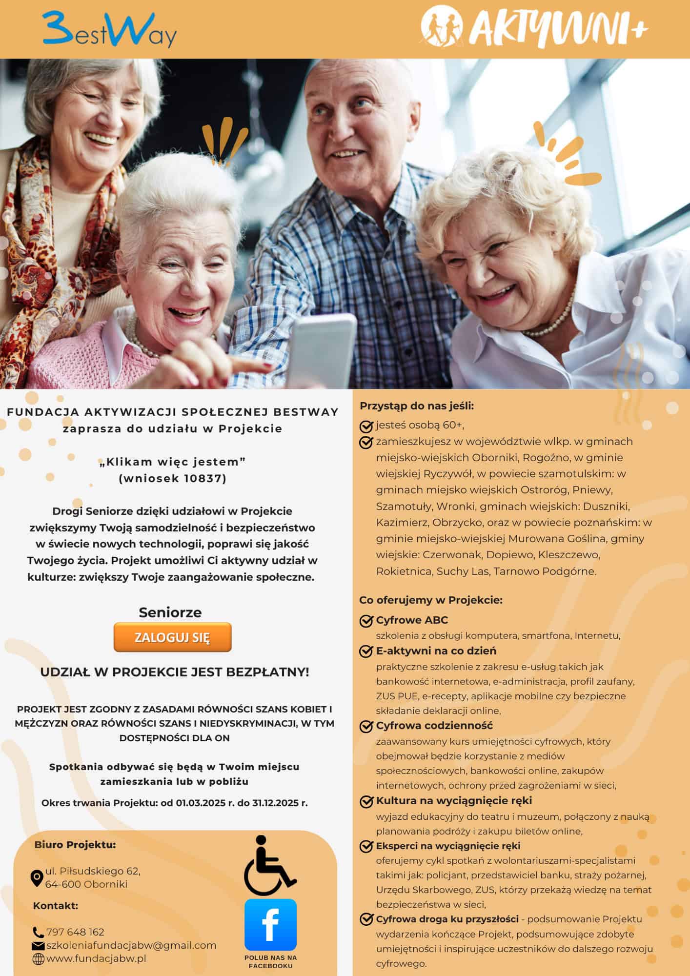 Celem Projektu do 31.12. 2025 r. jest włączenie cyfrowe 204 osób, w wieku 60+, zamieszkujących powiat obornicki, szamotulski, poznański, poprzez organizację bezpłatnych działań na rzecz zwiększania umiejętności posługiwania się nowoczesnymi technologiami i korzystania z nowych mediów przez osoby starsze, oraz upowszechnianie i wdrażanie rozwiązań technologicznych sprzyjających włączaniu społecznemu, oraz bezpiecznemu funkcjonowaniu osób starszych.